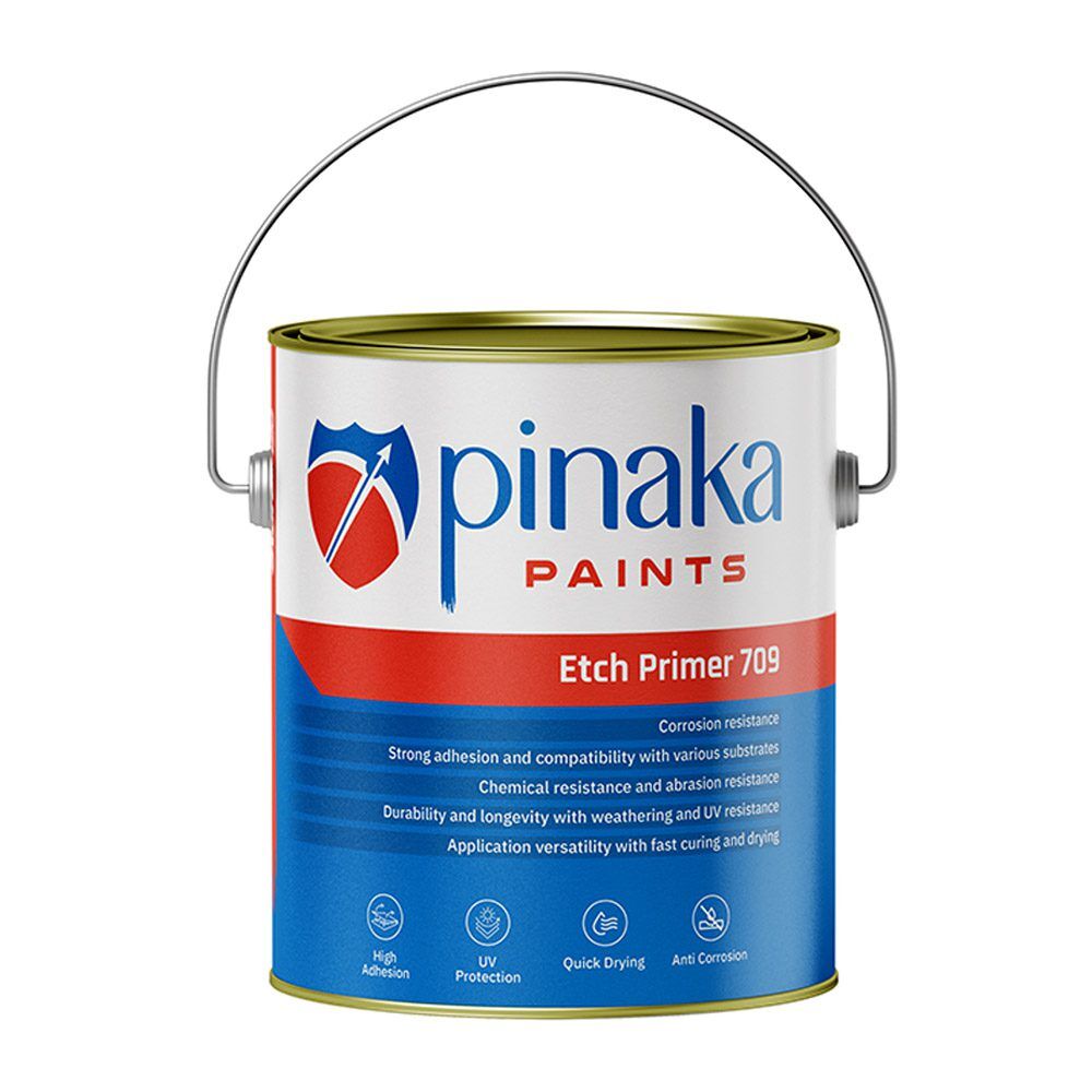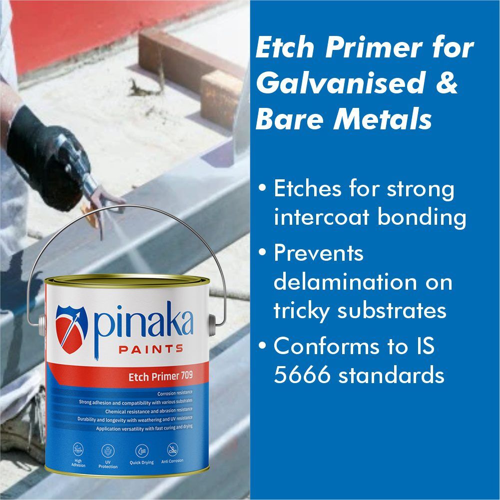 Pinaka Etch Primer 709 is a two-component, low-viscosity primer formulated with zinc tetroxy chromate for superior bonding on galvanised and bare metal surfaces. It microscopically etches the substrate to improve intercoat adhesion, forming a reliable base for further coatings.