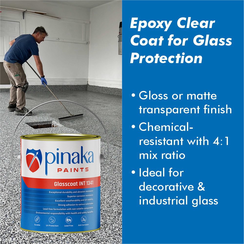 Pinaka Glasscoat INT 1341 is a premium two-component epoxy clear coat designed specifically for protective and aesthetic finishing on glass substrates. With a water-white finish and excellent sprayability, it delivers a durable, glossy or matte film that maintains clarity while enhancing chemical resistance and recoatability. Ideal for both decorative and industrial glass applications, it offers fast drying and excellent intercoat adhesion.