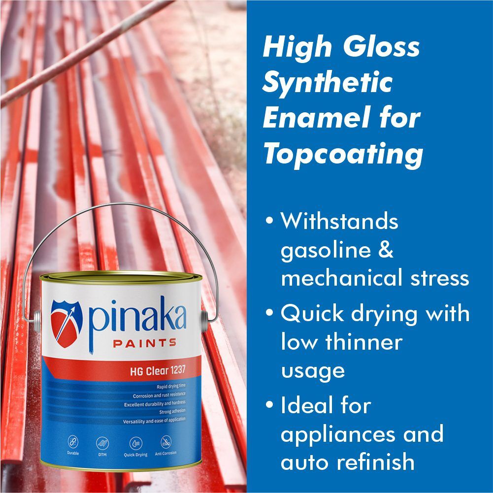 Pinaka HG Clear 1237 is a single-component synthetic enamel designed for automotive refinishing and appliance topcoating. It forms a tough, glossy, and flexible film that resists gasoline, offers good mechanical durability, and provides long-lasting colour retention.