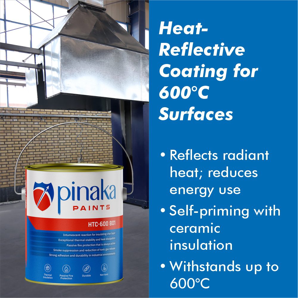 Pinaka HTC-600 801 is a high-performance, single-component aluminium-pigmented silicone coating designed to reduce radiant heat loss and guard against high-temperature corrosion. It forms a bright, reflective ceramic barrier that minimises heat transfer and condensation on industrial equipment operating at temperatures up to 600°C.