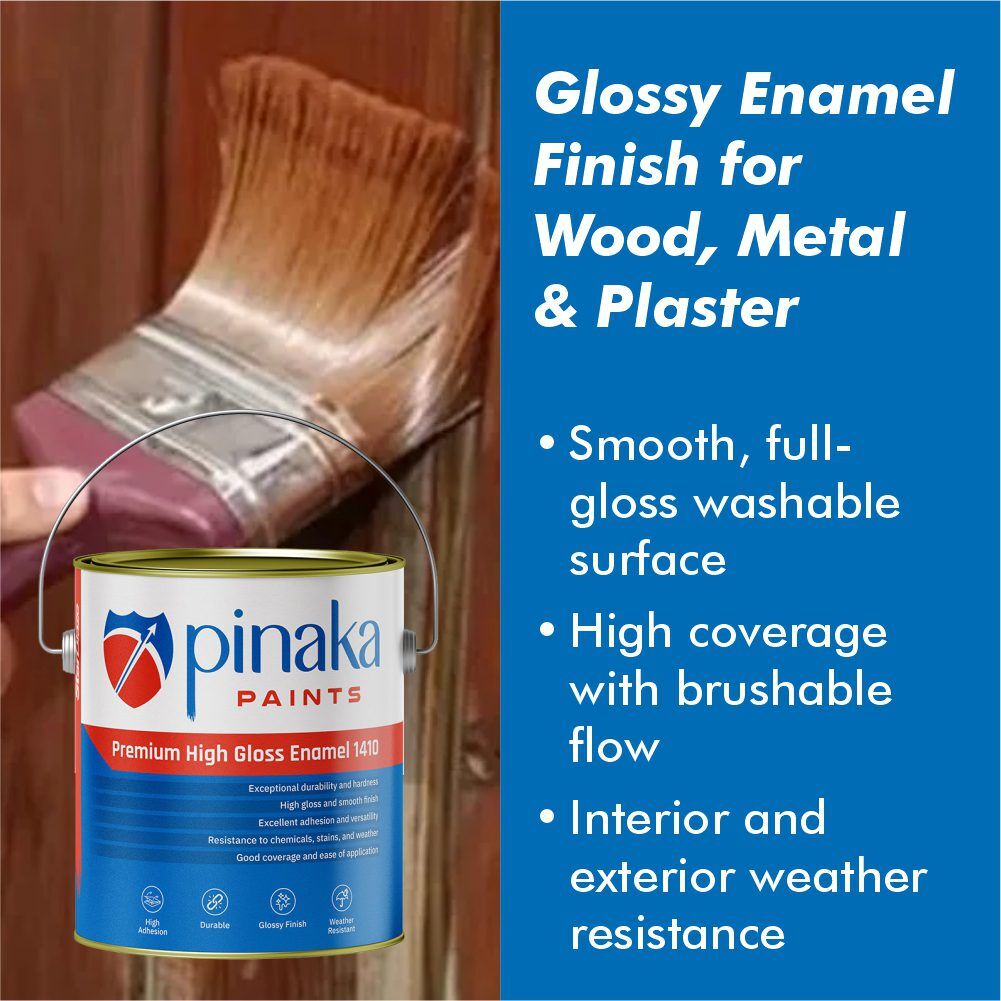 Pinaka Premium High Gloss Enamel 1410 is a single-component, alkyd-based enamel that delivers a smooth, glossy finish with long-lasting durability. It provides excellent brushability, high coverage, and a washable surface, making it suitable for both interior and exterior wood, metal, and plaster.