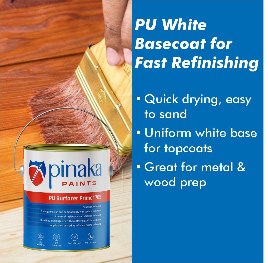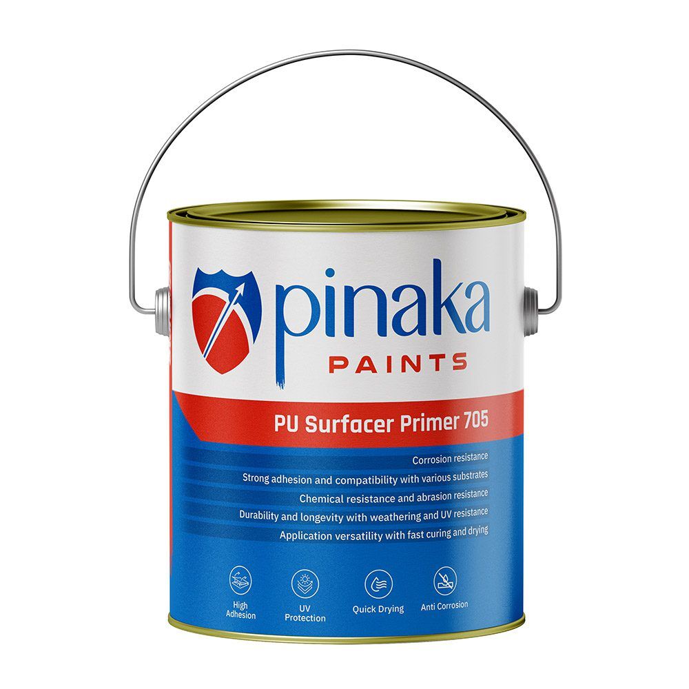 Pinaka PU Surface Primer 705 is a fast-drying, two-component polyurethane surfacer designed for automotive refinishing and industrial applications that require a white basecoat. It offers excellent adhesion, quick drying, and a smooth, sandable surface that improves the appearance and bonding of PU topcoats.