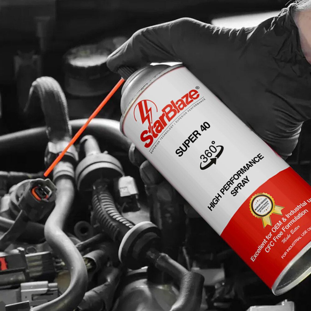 StarBlaze Super 40 is a multifunctional, high-performance spray formulated to clean, lubricate, displace moisture, and protect metal and electrical components from corrosion. Its advanced formulation penetrates deep into tight spaces, rapidly loosening rust, scale, and grime while creating a long-lasting barrier against moisture ingress and oxidation. With a dielectric strength of 47 KV, it restores electrical integrity and prevents short circuits. The 360° spray action ensures full coverage even in hard-to-reach areas. Ideal for maintaining electrical systems, mechanical assemblies, and sensitive equipment across demanding industrial environments.